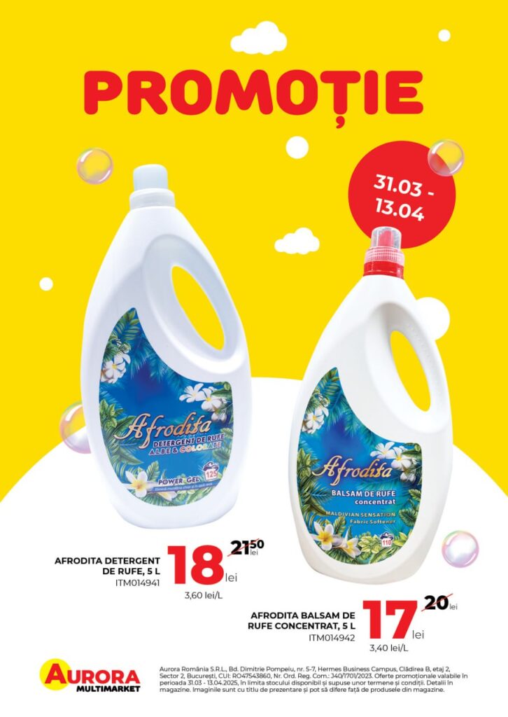 Primăvara este momentul perfect pentru a-ți reîmprospăta locuința, iar la Aurora Multimarket găsești produse de curățenie cu reduceri de până la 50%. Fie că ai nevoie de detergenți, soluții de curățare, bureți sau lavete, ai la dispoziție o gamă variată de produse eficiente și accesibile!
